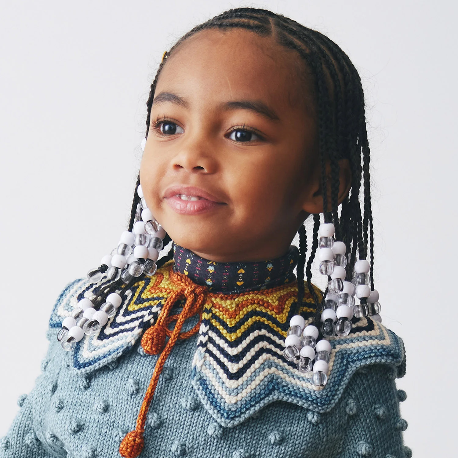 A new and entirely hand-knit unique collar in Merino wool, with a multi-colour chevron pattern, soft zigzag points, and popcorn tie closure.